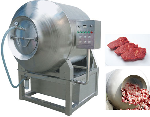 真空滚揉机是在真空状态下,原料肉在罐内上下翻动相互撞击摔打,从而实现均匀分布按摩淹渍作用,间歇时产生肺呼吸功能,原料肉的纤维组织松散扩张,使淹渍效果更佳,经真空滚揉机滚揉后原料肉会得到充分吸收辅料,提高肉质弹性和结合力,使肉质增加柔嫩性,保水性,结构稳定,保证制品的切片性,防止切片时产生破碎裂口。