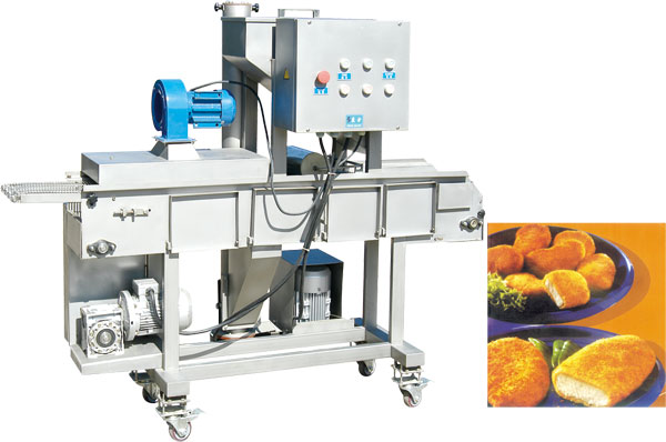 上面包屑机自动完成产品的上面包屑过程,细屑、粗屑均可。 上浆后的产品进入下网带,底部及侧面沾满面包屑,从上料斗流下的面包屑将产品上部覆盖,经过压辊压紧(上、下网带上的面包屑厚度可方便调节),上面包屑后经风淋,将多余的面包屑吹落。